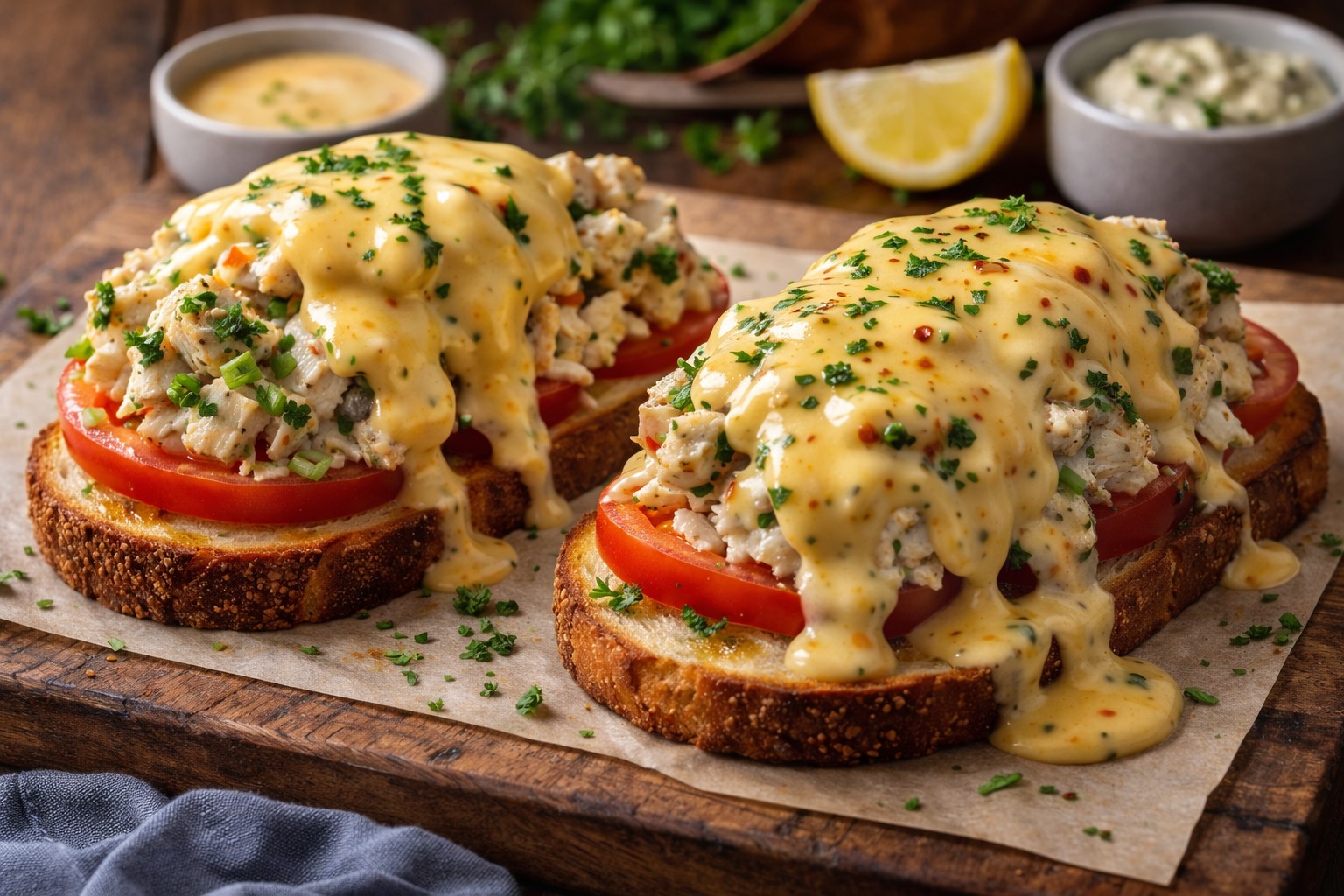 A warm, cheesy twist on halibut—stacked on toasted sourdough and finished with a rich sauce that brings it all together.