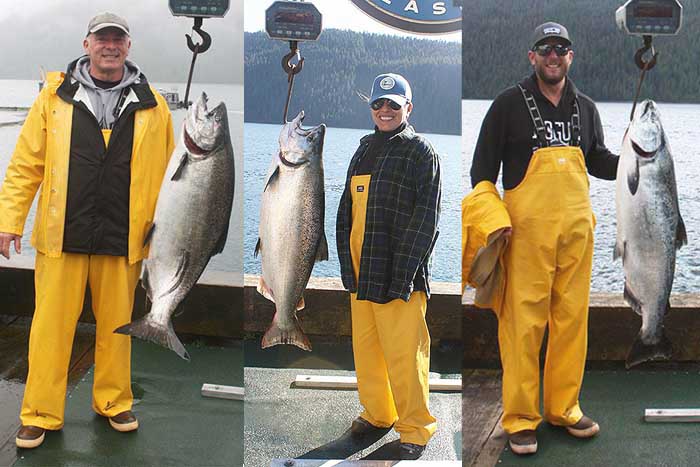 At posting time, Tony Perkins of Kirkland, Washington, continues to top the King of Kings tournament leaderboard with his 48.2-pound king, caught July 16. That fish landed him King of the Day, a King of the Day ball cap, and King of the Week, with its prize of a return trip to Waterfall Resort in 2019. While Perkins (above, left) landed his prize-winning fish on his third season with us, second and third place are currently held by two first-time guests.